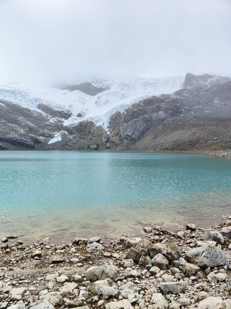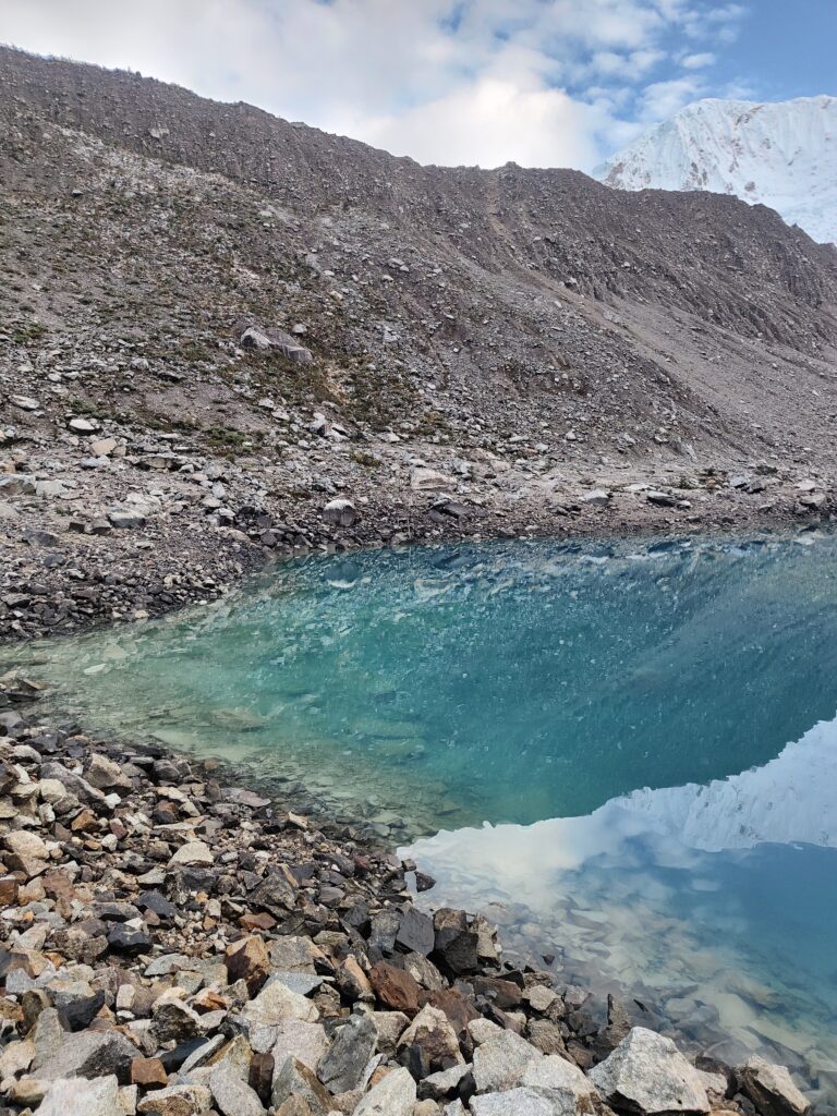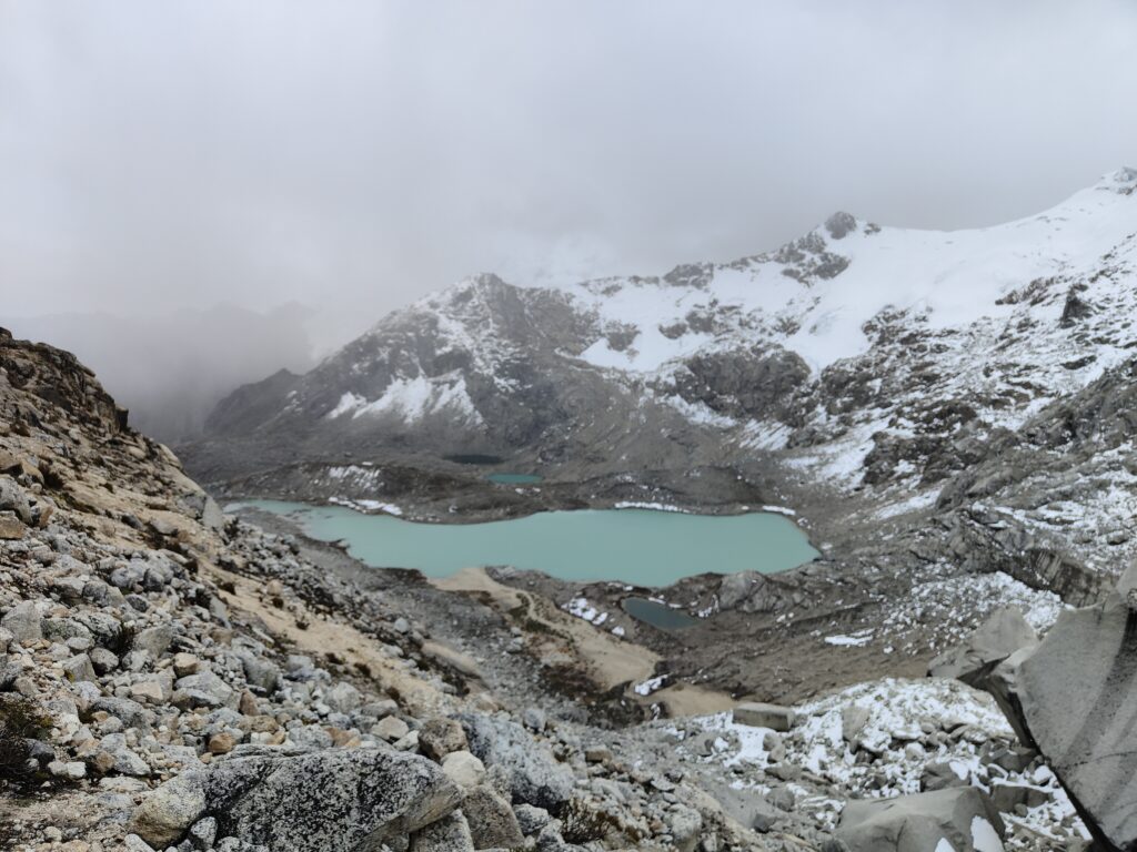 Quelques belles vues sur la vallée, parsemée d’une fine couche de neige, et sur les glaciers. La laguna Palcacocha, désormais ensoleillée, présente de beaux tons turquoises. En grimpant, le décor devient de plus en plus minéral, je croise quelques petites lagunes aux couleurs diverses et de petits glaciers, cela devient si banal qu’on n’y prêterait même plus attention.