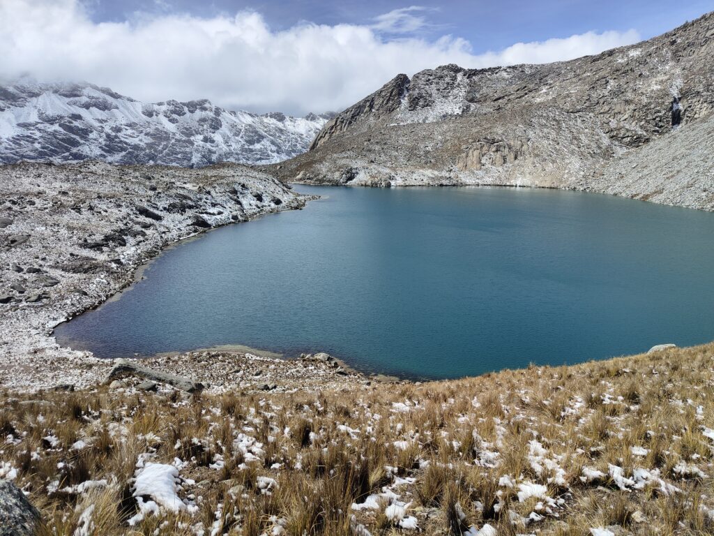 La neige cesse peu à peu, je reprends la descente vers la vallée. Sous le col, la laguna Ishinca se dévoile dans un décor glaciaire. Non loin, on peut apercevoir le petit (et basique) refuge Vivaque Longoni, ouvert uniquement en saison (et sur demande ?).