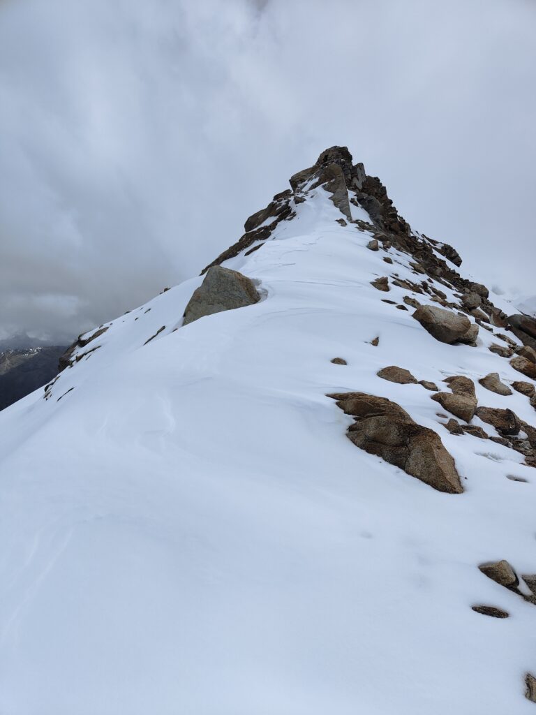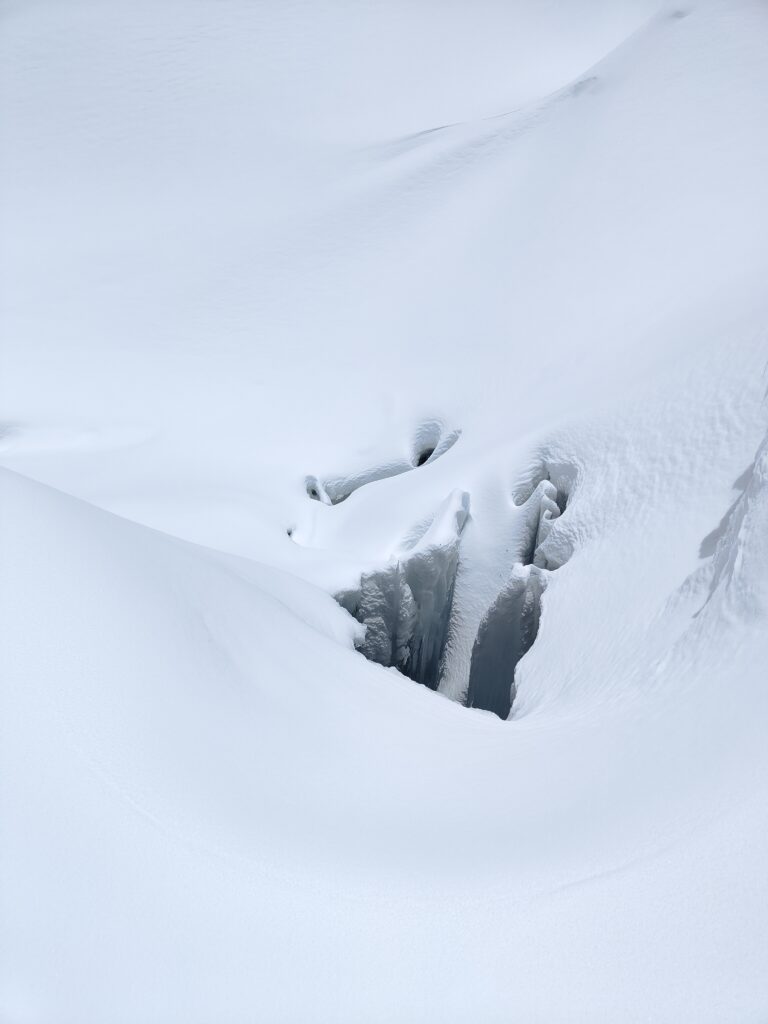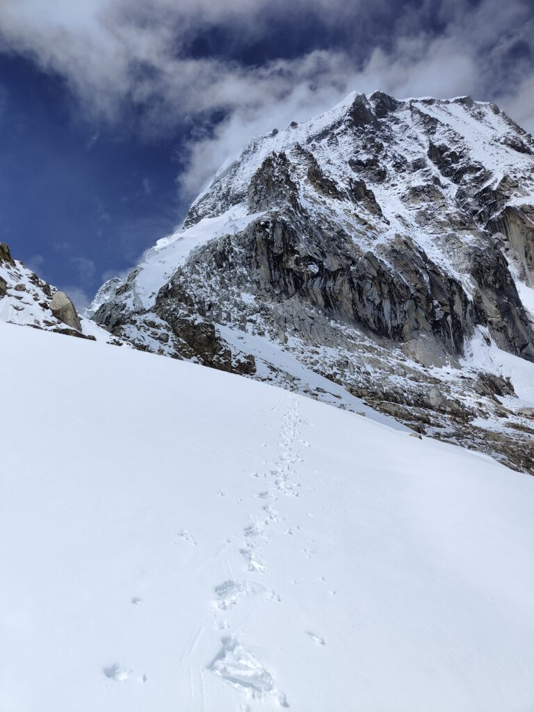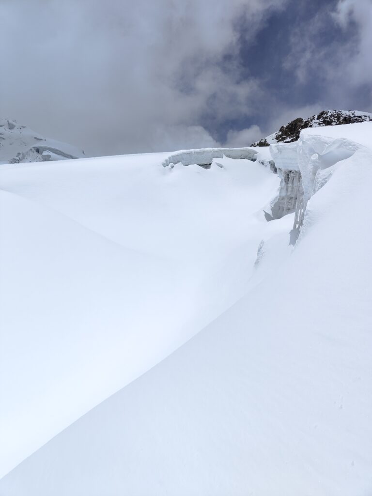 Je découvre l’autre partie du col, supposée sur glacier, qui en effet est recouverte d’une épaisse couche de neige. Je me suis renseigné quelques jours plus tôt auprès de guides, le paso ne présente selon eux pas de difficulté particulière hormis une bonne couche de poudreuse. Visuellement, cela semble se confirmer mais je devine de possibles crevasses au loin.