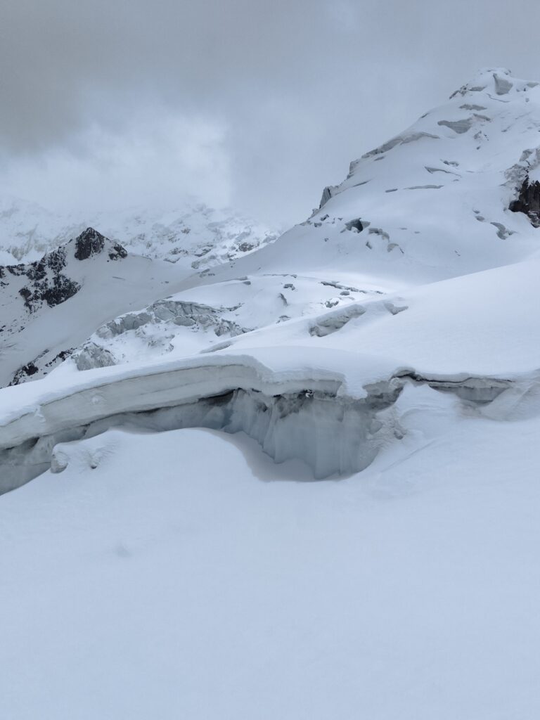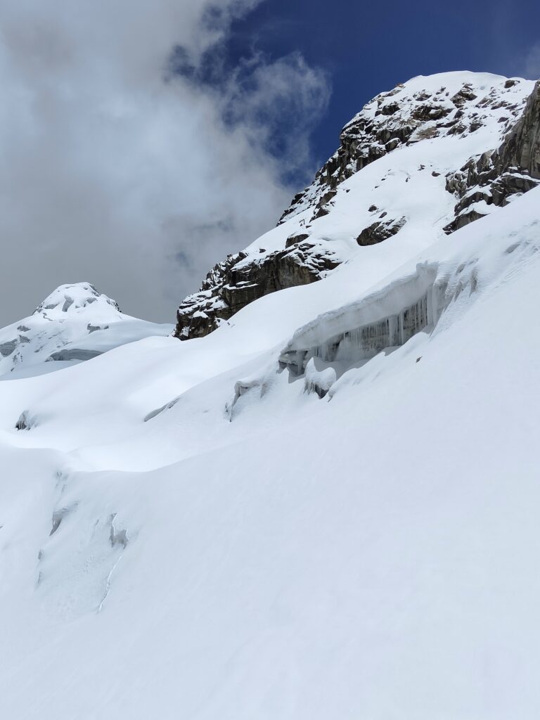 Je tente de contourner par le sud mais impossible. Je remonte pour passer cette profonde cavité par le nord, sans parvenir à trouver une solution. Une rampe de neige semble descendre dans celle-ci puis remonter de l’autre côté. Autour quelques trous, j’hésite. J’ai beau tâtonner avec les bâtons, la neige est bien trop profonde et je ne touche que rarement le sol. Je décide de passer, partagé entre l’idée de progresser doucement et l’envie de vite en ressortir. Soudain je m’enfonce de 60 bons centimètres. C’est une combe, où la neige s’est entassée, mais la sensation de chute sur l’instant ne me laisse pas indifférent. Derrière le Ranrapalca (6162m) gronde régulièrement et laisse s’échapper des blocs de glace avec fracas.