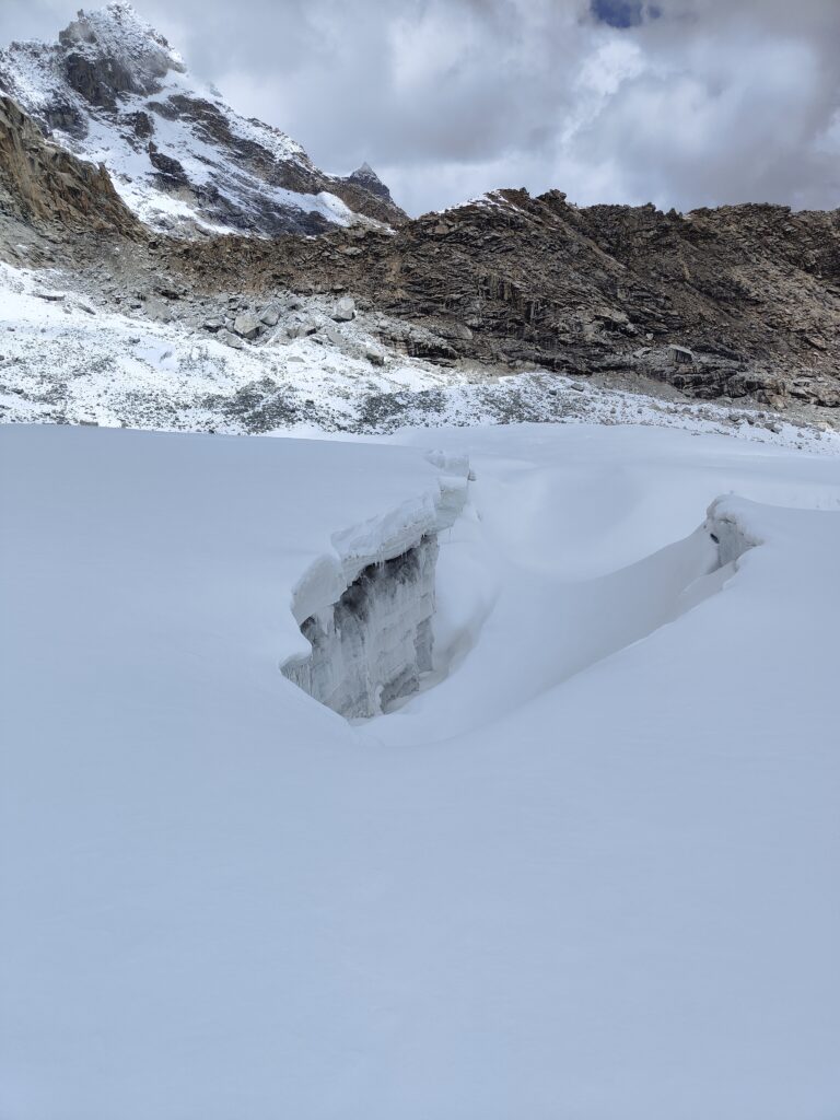 Le vent est glacial et n’invite guère à la réflexion, je me couvre et j’enfile les crampons rapidement. Je lis la trace une dernière fois et je m’élance sur le glacier. La neige est épaisse, les crampons ne sont sans doute pas nécessaires mais permettent avec les bâtons de garder l’équilibre. Sur la droite, j’aperçois du beau sommet de l’Ishinca (5530m). Mieux équipé et sans doute à une période plus propice, j’aurais volontiers fait un détour par cette cime immaculée. Je consulte régulièrement le GPS pour m’assurer d’être sur le bon itinéraire. La neige a recouvert toute empreinte, je ne peux me fier à rien d’autre sinon à mes yeux. A un moment, je me retrouve face à une fosse de quelques mètres. Je suis pourtant bien sur la trace GPS, mais clairement pas confiant à l’idée de descendre là-dedans.