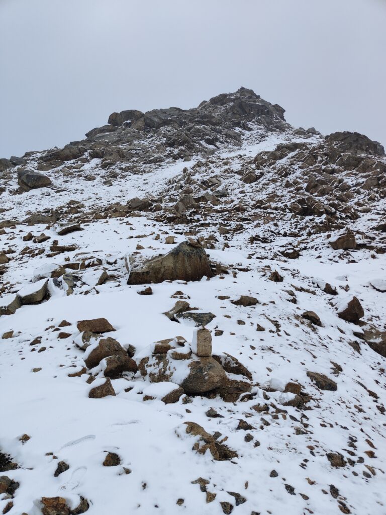 Après 2 jours de souffrance, enfin je marche à bonne allure. Le sac est certes plus léger, mais le corps s’est remis en condition. J’en profite pour remettre un coup d’accélérateur alors que la neige commence. La dernière portion jusqu’au col est bien moins évidente. Une casse (pente d’éboulis) s’étend sous le col, constituant peut-être une meilleure option lorsqu’elle est enneigée (mais c’est purement hypothétique), notamment en descente. Les cairns signalent un parcours plus aérien au travers de dalles rocheuses qu’il convient d’escalader en posant les mains. Pas de difficulté technique particulière mais des jambes lourdes, un sac chargé et surtout des dalles humides et glissantes rendent l’exercice un peu plus complexe. La neige qui me fouette le visage ne me permet pas de sortir le GPS pour vérifier ma position et un cairn m’induit en erreur sur une portion piégeuse et exposée. Je détruis le cairn insidieux et je reprends le bon itinéraire jusqu’au col.