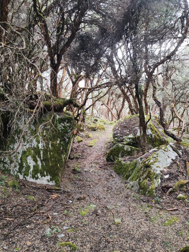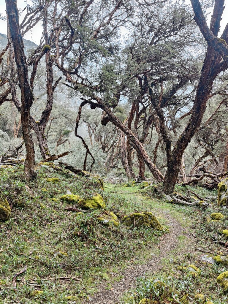 La vallée se réduit, s’élargit de nouveau, et laisse place à une longue forêt de polylepis aux couleurs chatoyantes. Malgré quelques bestiaux qui traînent et des zones un peu plus humides, il y a l’embarras du choix pour poser une tente en cas de bivouac.